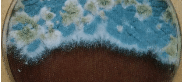Und hier eine Reinkultur von Aspergillus fumigatus aus Topferde. Bei Kompostierungsstadien kann die Pilzflora bis zu 80% aus Aspergillus bestehen.